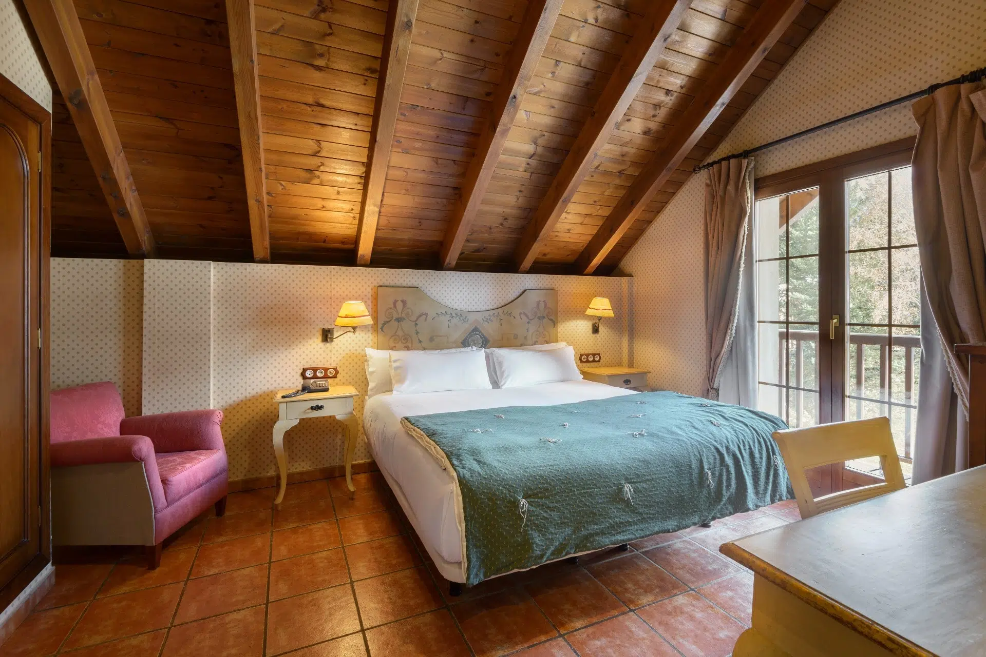 Todas las habitaciones tienen techos de madera, calefacción por suelo radiante con termostatos independientes en habitación y baño, caja fuerte, amplios armarios y mobiliario rústico-moderno seleccionado cuidadosamente para conseguir una decoración acogedora y diferenciadora.
